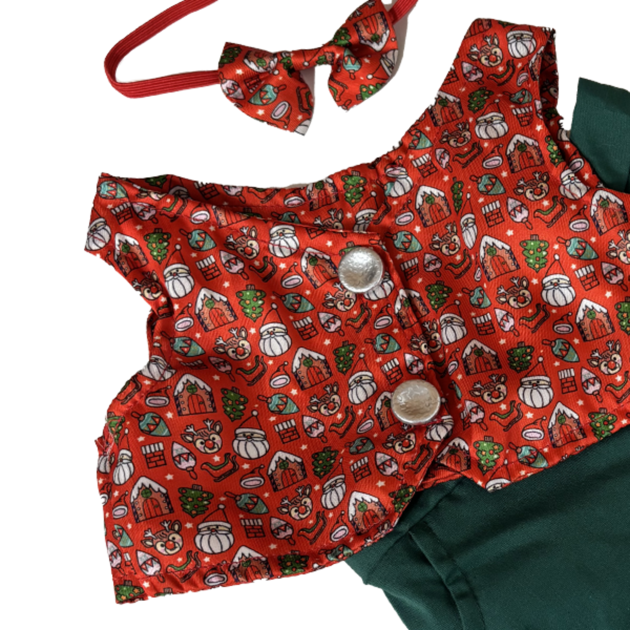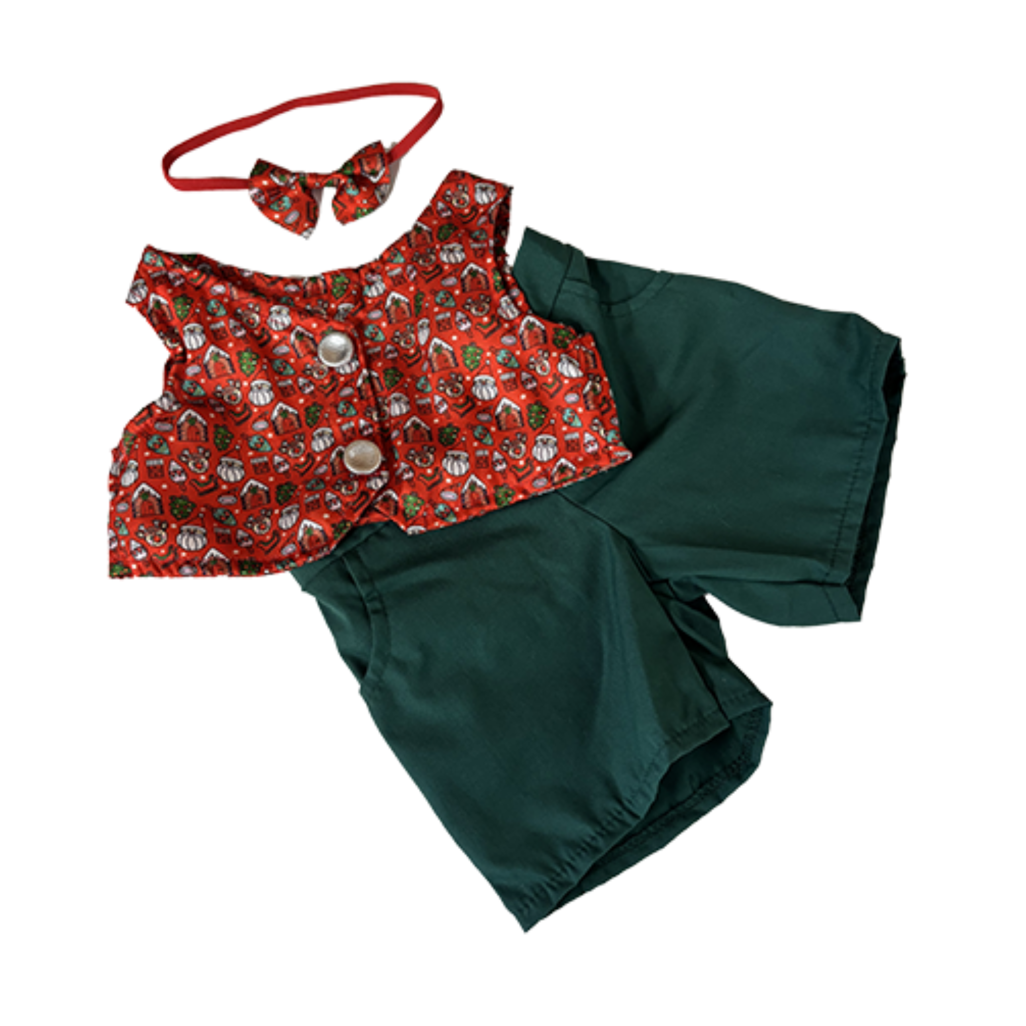 Dress your plush buddy to the nines! This Festive Vest & Bowtie Outfit turns any 16" teddy bear or stuffed animal into the best-dressed guest at every holiday gathering. Featuring a cheerful holiday-print vest, a matching bow tie, and a pair of green denim pants, this outfit delivers instant charm and Christmas-card-worthy cuteness. (Bear sold separately!)