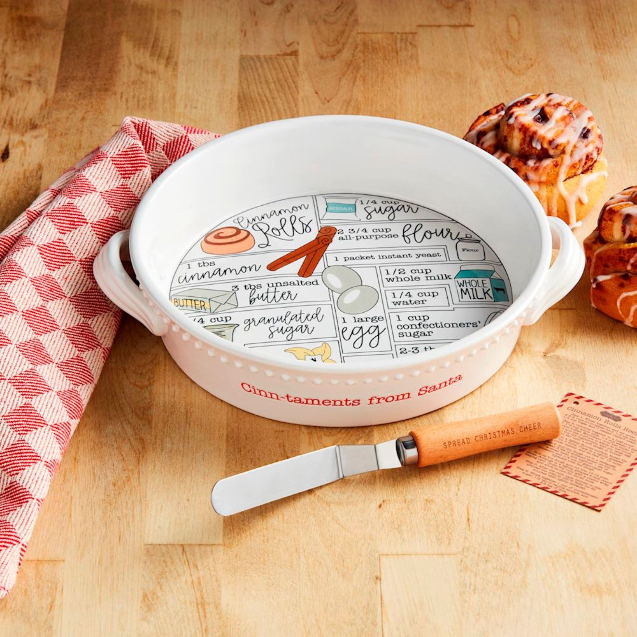 The dish reads "Cinn-taments from Santa" along the side, adding a sprinkle of charm to every batch. You'll also get a wood and metal spreader that says "Spread Christmas Cheer" and a vintage-style kraft recipe card. Wether you're baking with the grandkids or gifting it to your favorite cinnamon roll lover, this set is sugar, spice, and everything nice.
