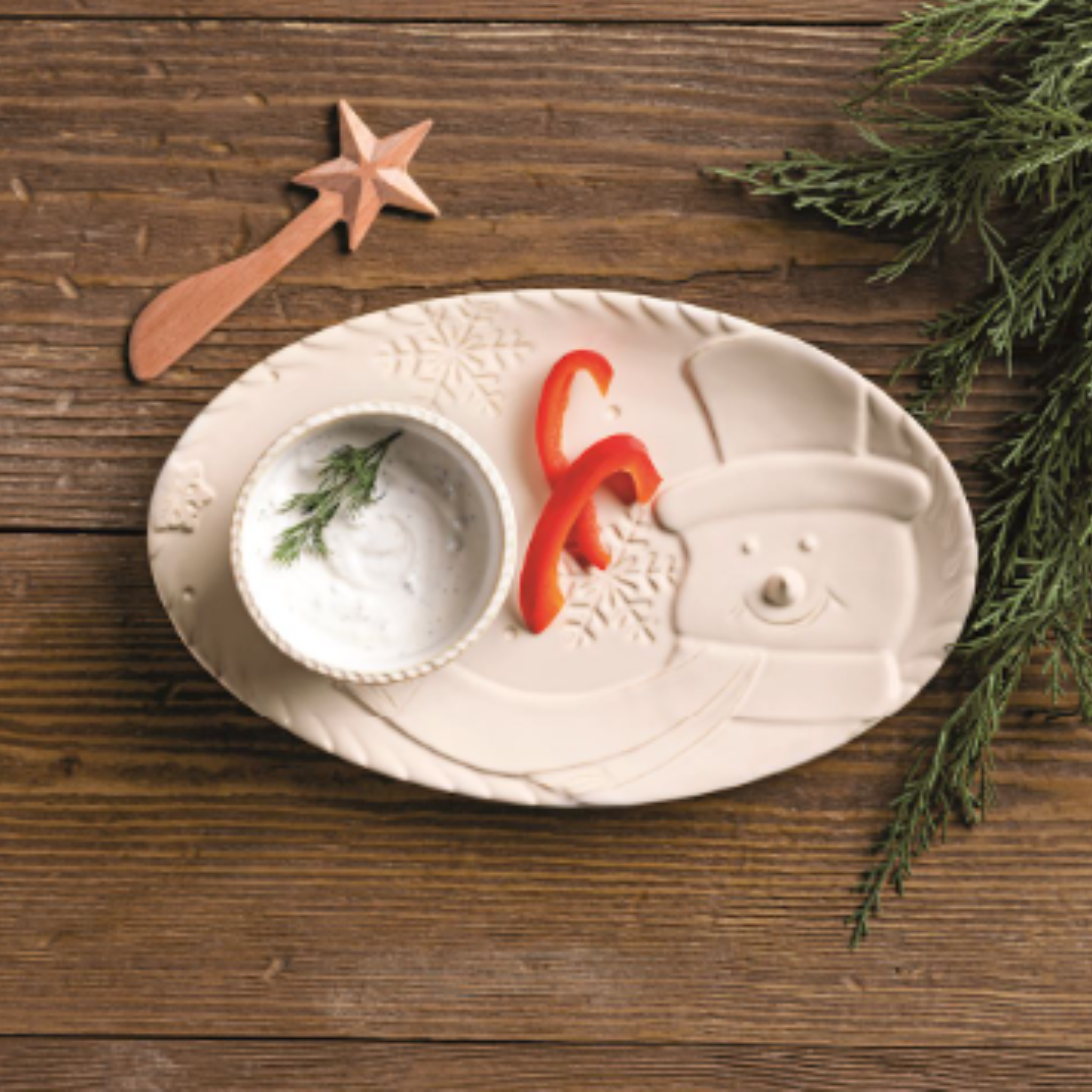 Make your holiday table merry and bright with this White Snowman Tray & Dip Set! Crafted in milk-glazed stoneware, the tray features a textured snowman design surrounded by delicate snowflakes. Paired with a matching tidbit bowl and wooden spreader, it's ready for dips, spreads, or your favorite holiday treats.
