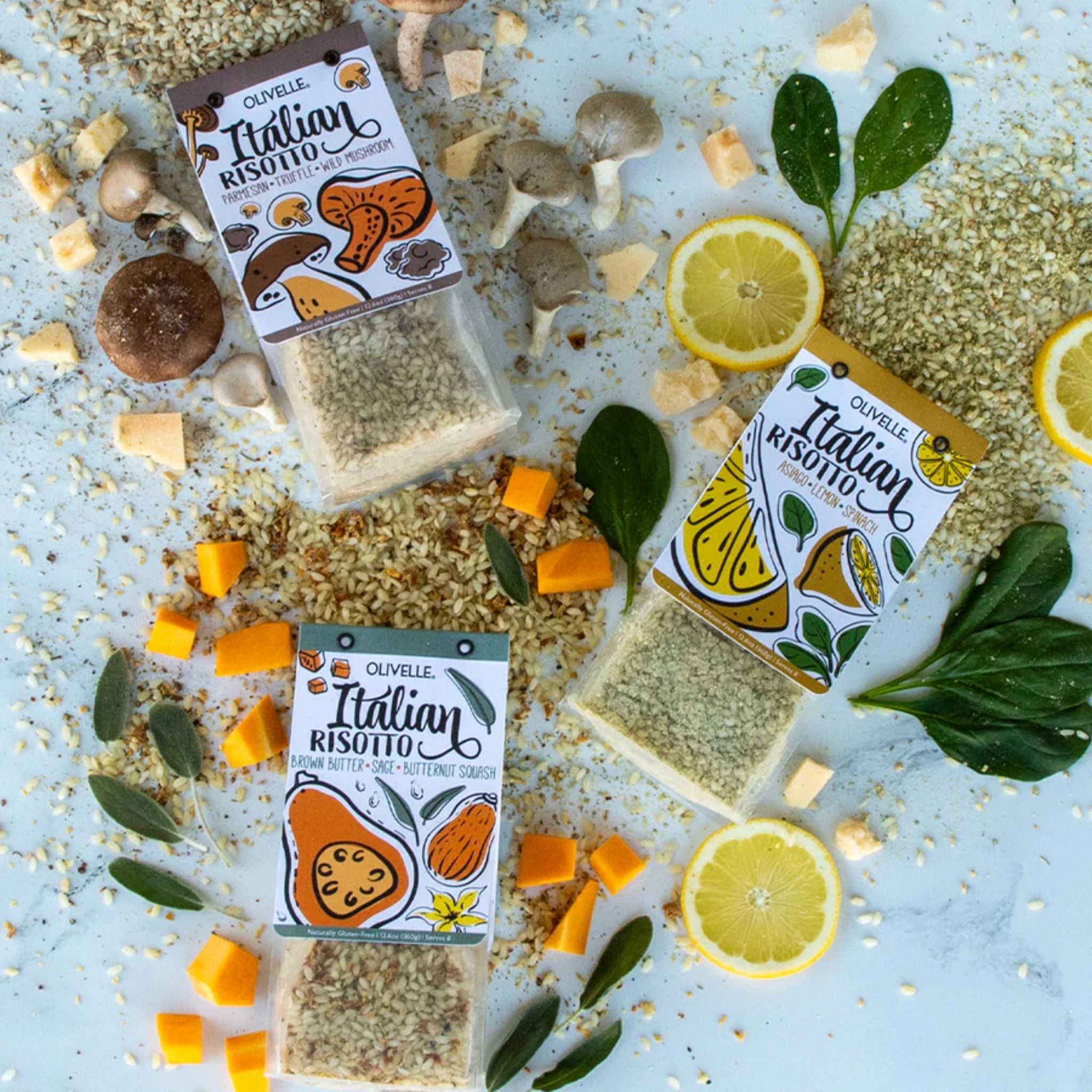 Pick your risotto vibe-Asiago Lemon Spinach, Brown Butter Sage Butternut Squash, or Truffle Mushroom (our personal fave!)-and let the flavors do the heavy lifting. Whether you’re gifting it or grabbing one for your own cozy night in, this bundle makes risotto feel approachable, fun, and totally delicious.