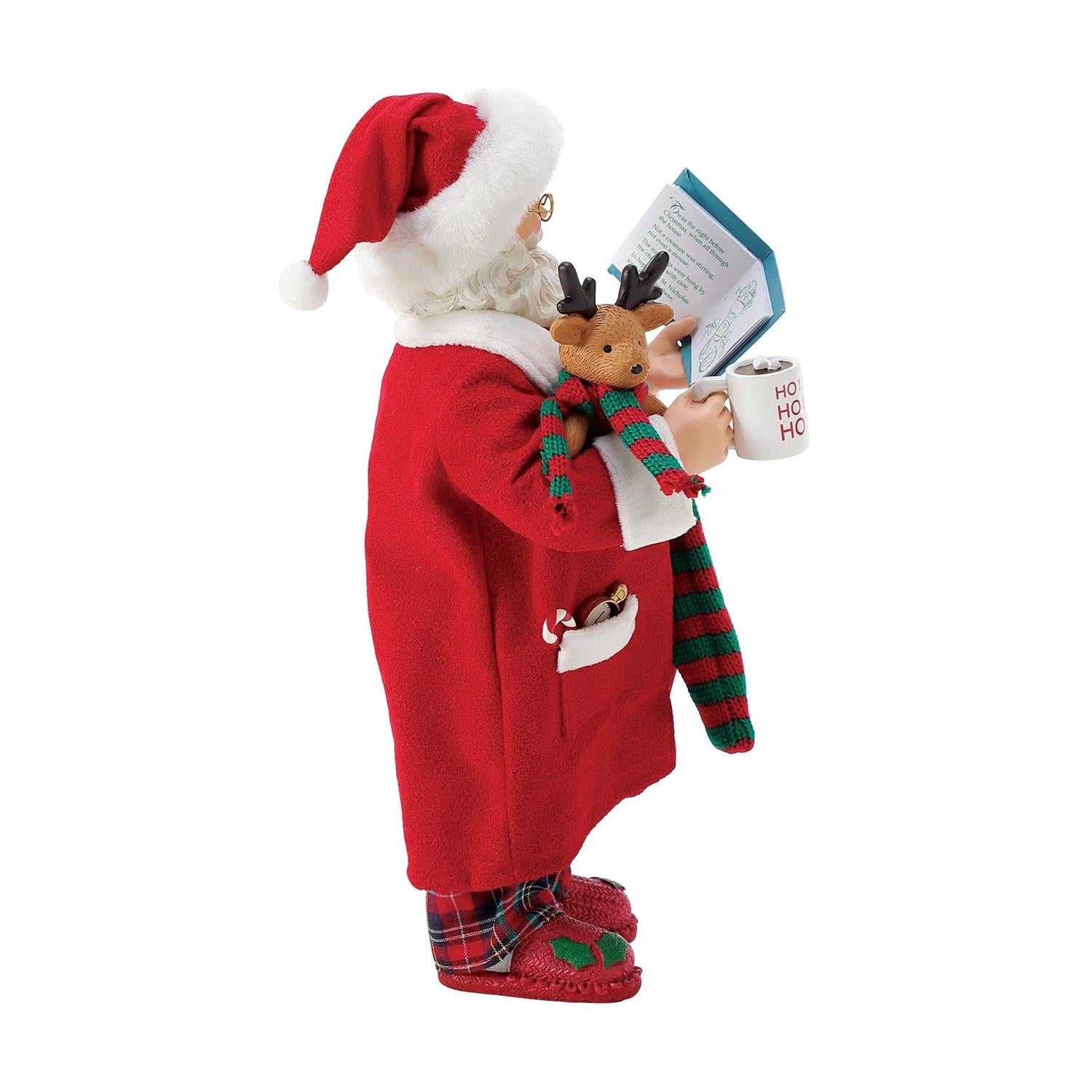 This charming Possible Dreams collectible shows Santa settling in for the night with his favorite bedtime story, dressed in plaid pajamas, red slippers, and a long red robe trimmed in white. He's holding a mug that reads "Ho! Ho! Ho!" and a little reindeer plush tucked under one arm - the perfect reminder that even Santa enjoys a quiet moment of relaxation after a long day of delivering cheer.