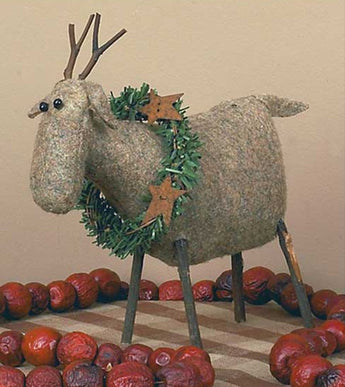 This cute reindeer measures in at 8 inches x 8 inches and is made of fabric and wood.