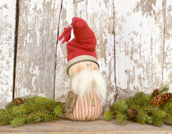 This vintage looking santa measures 7 inches tall with hat. He is made from various fabrics and metal accents.