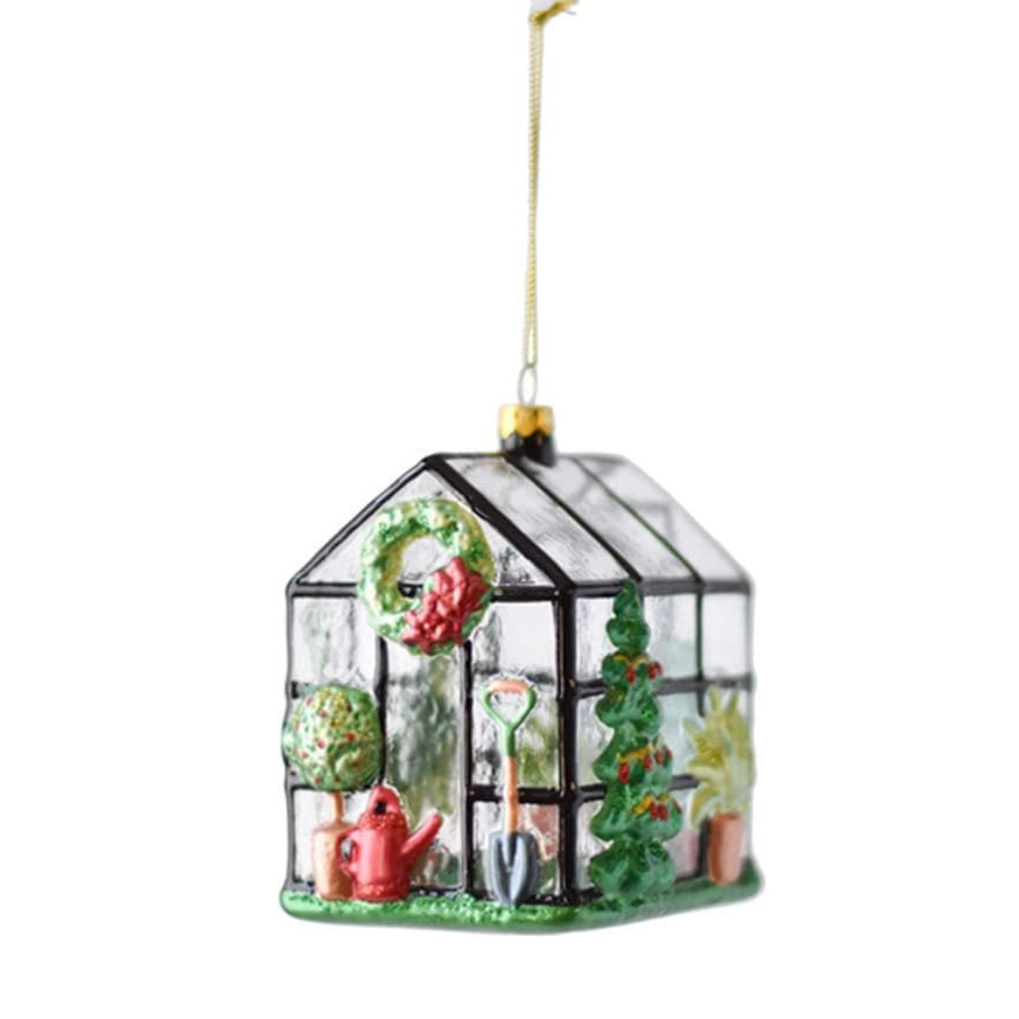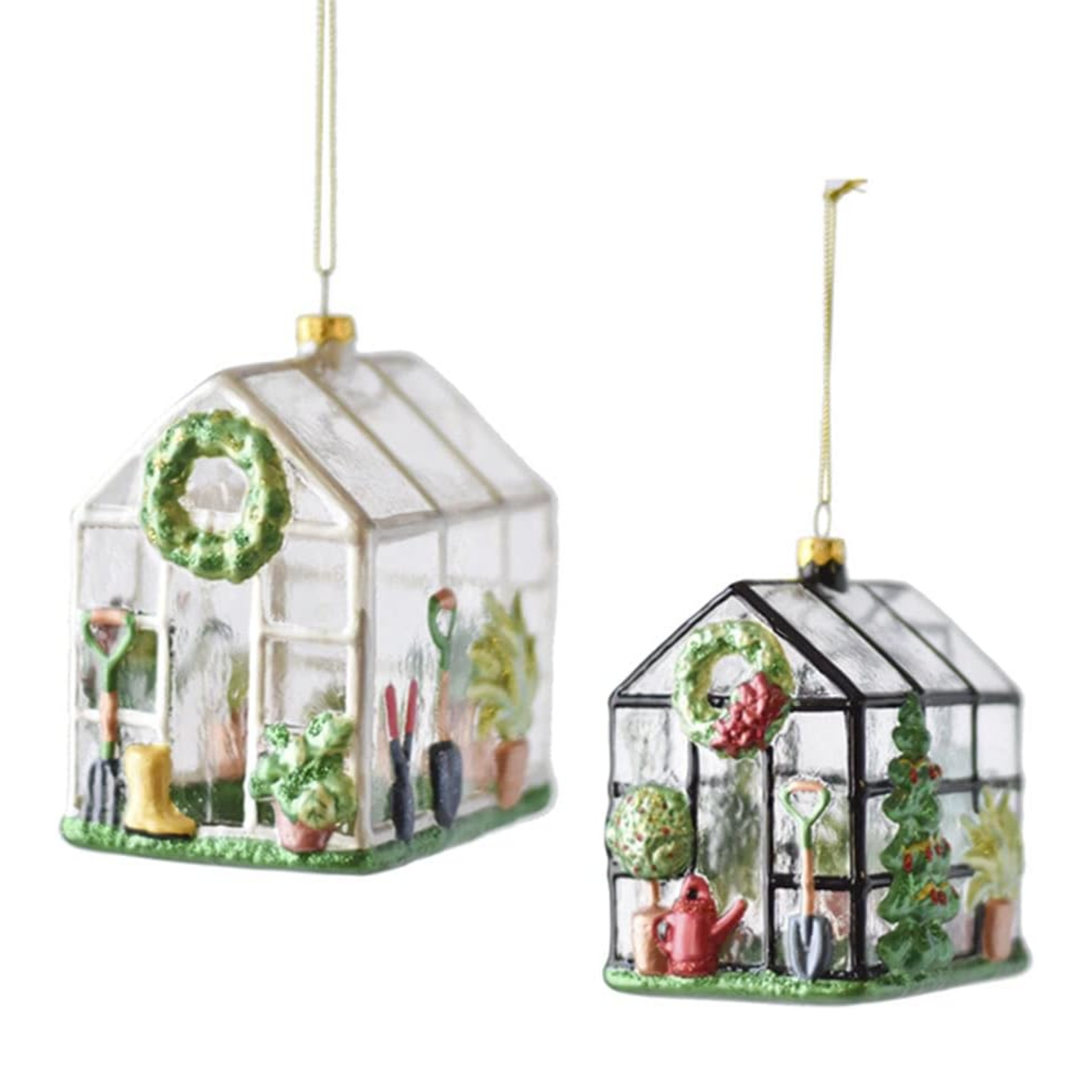 Crafted from shimmering glass and finished with fine details, each ornament measures 4" L x 4.5" H and hangs gracefully from a gold cord. Whether displayed on your Christmas tree, gifted to a gardening enthusiast, or used as year-round decor, these greenhouse ornaments make a thoughtful keepsake that blends holiday cheer with garden beauty.