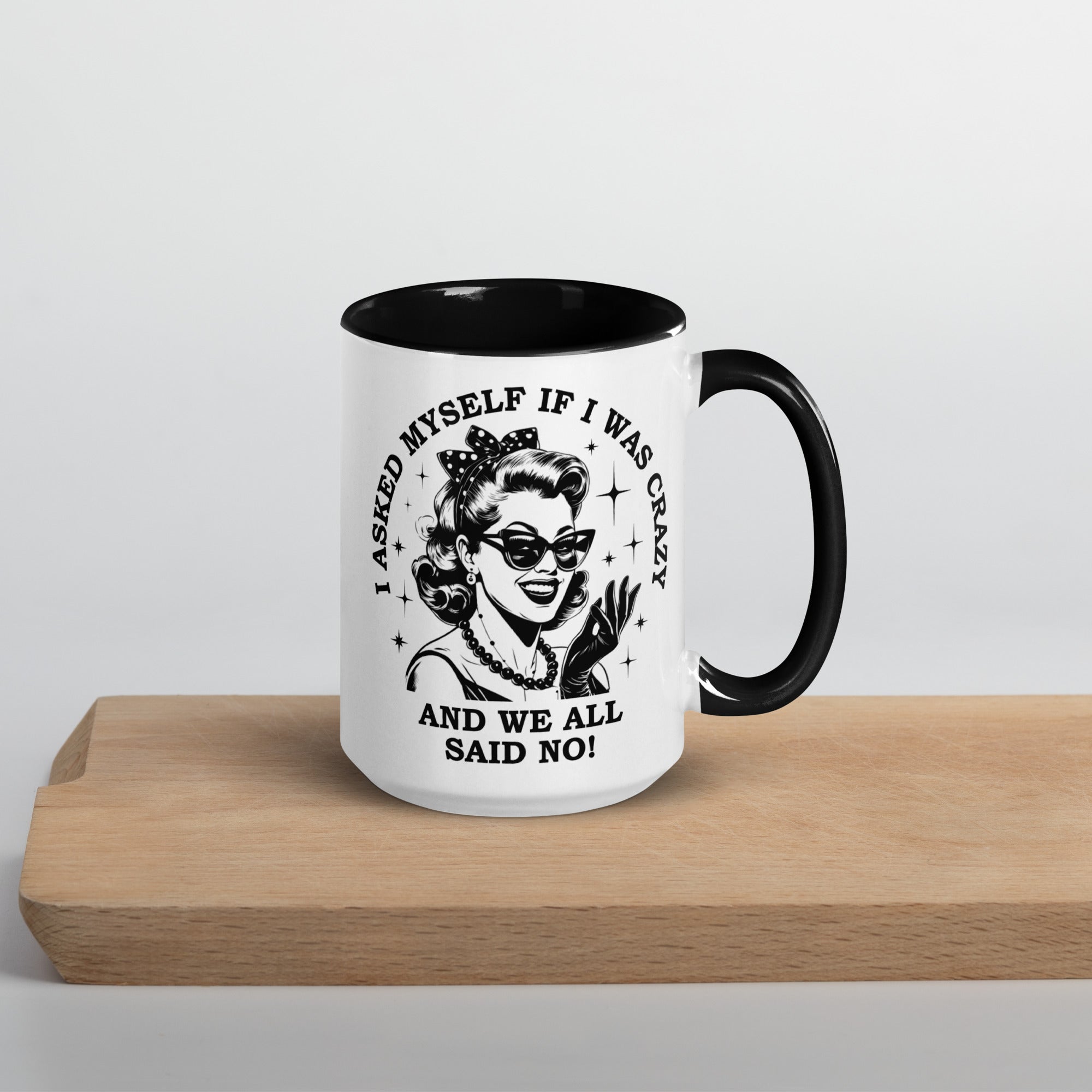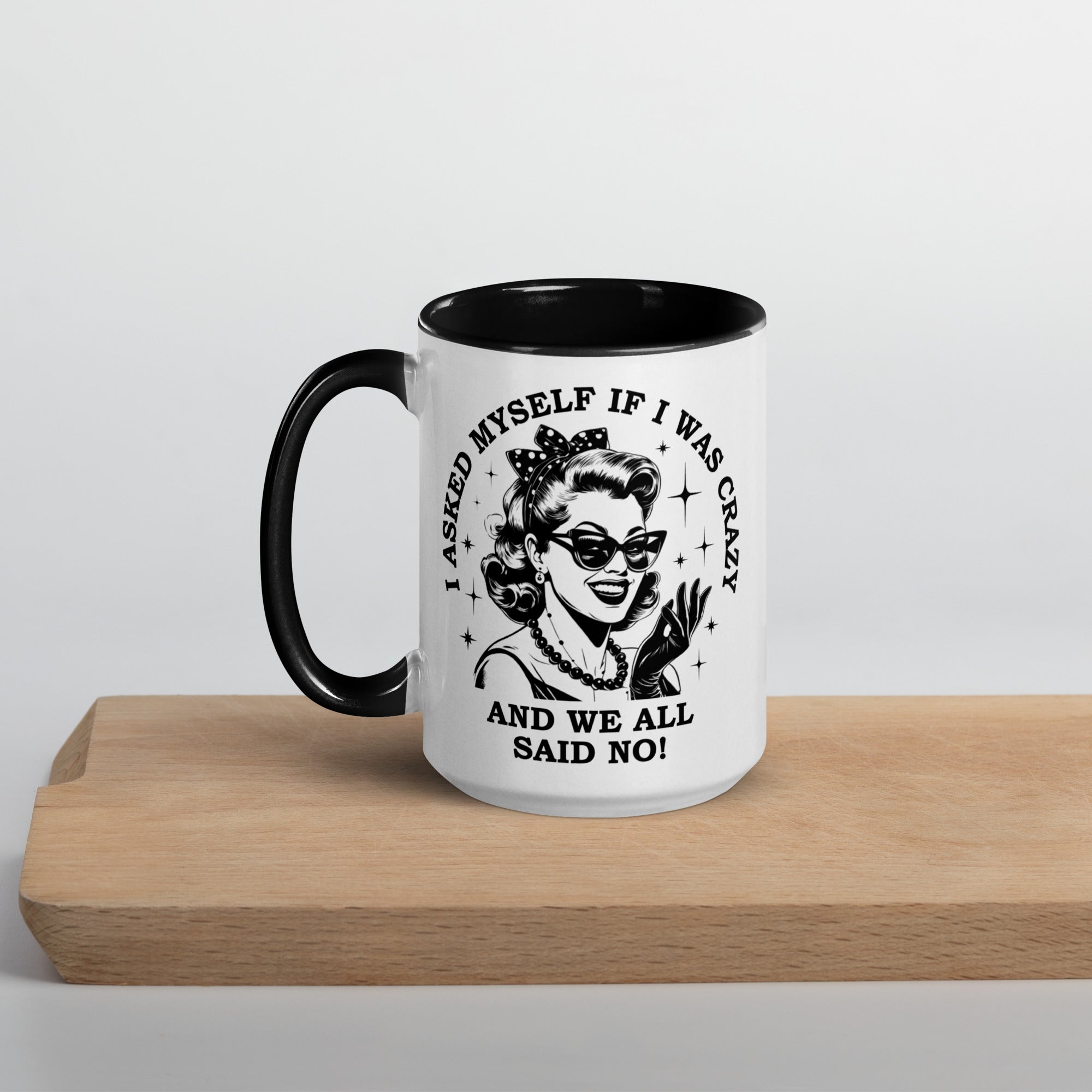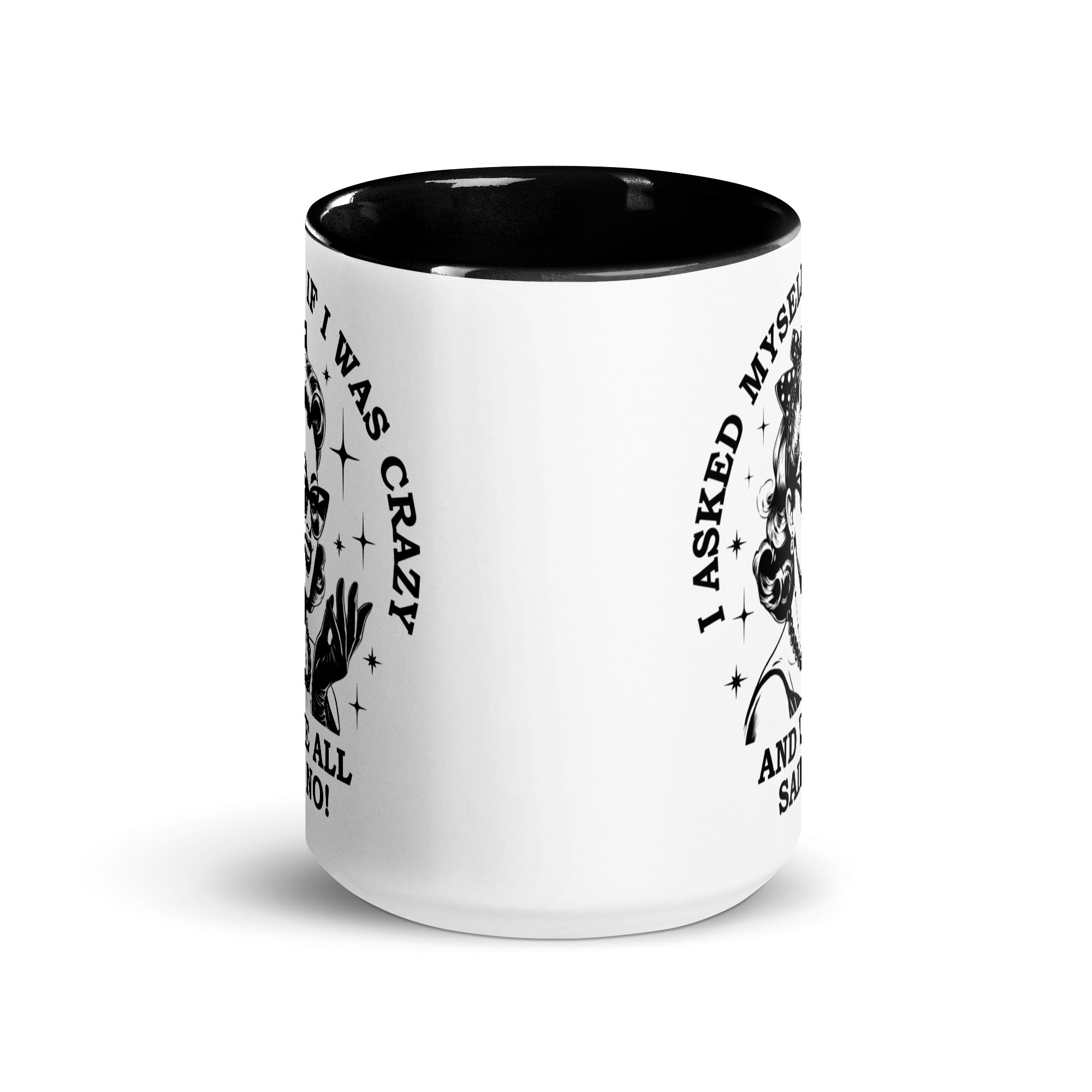This hilarious 15 oz ceramic mug features a retro-style lady front and center with the quote "I asked myself if I was crazy and we all said no." Designed on both sides so everyone can enjoy your sense of humor - whether you're right-handed, left-handed, or just unhinged enough to drink coffee at 3 p.m.