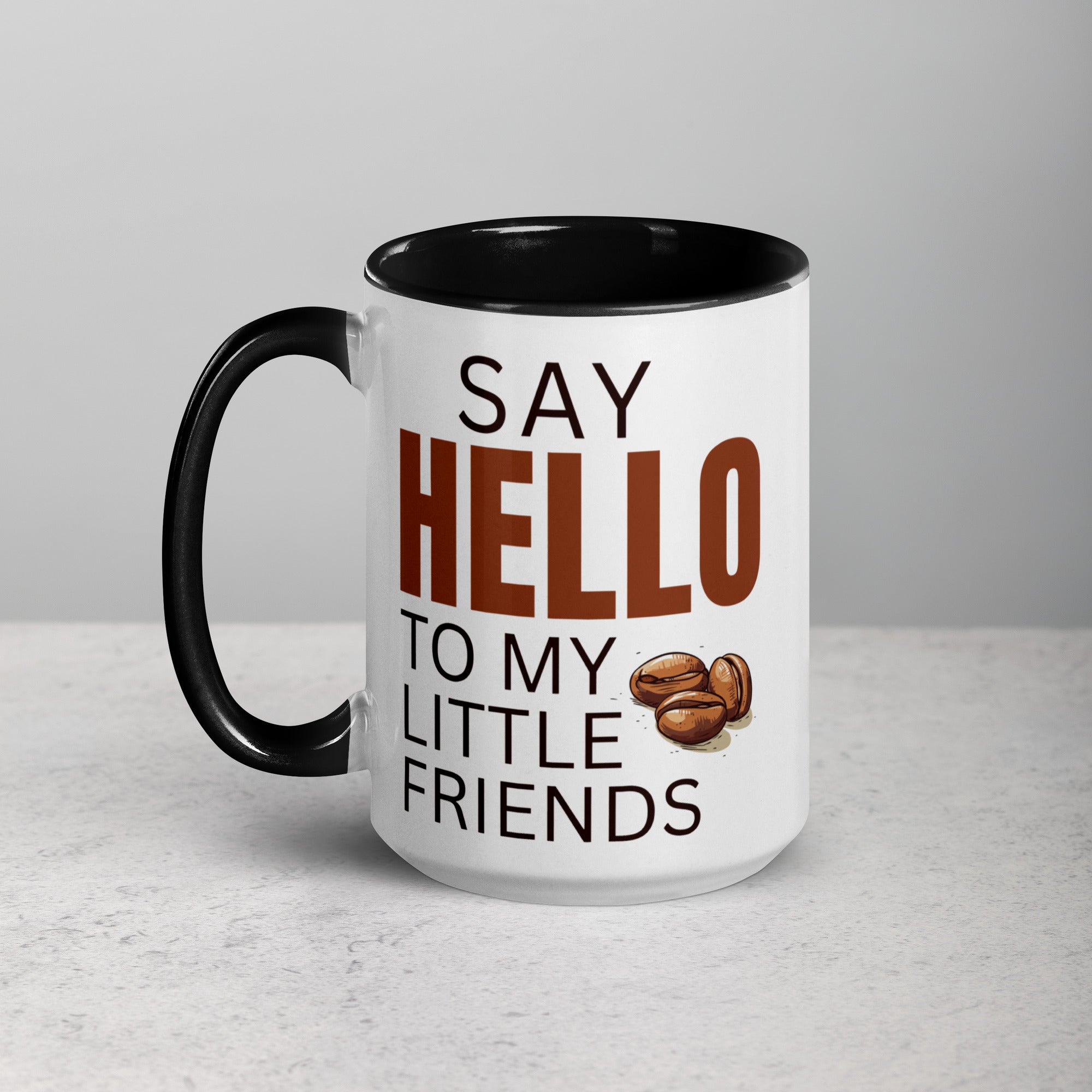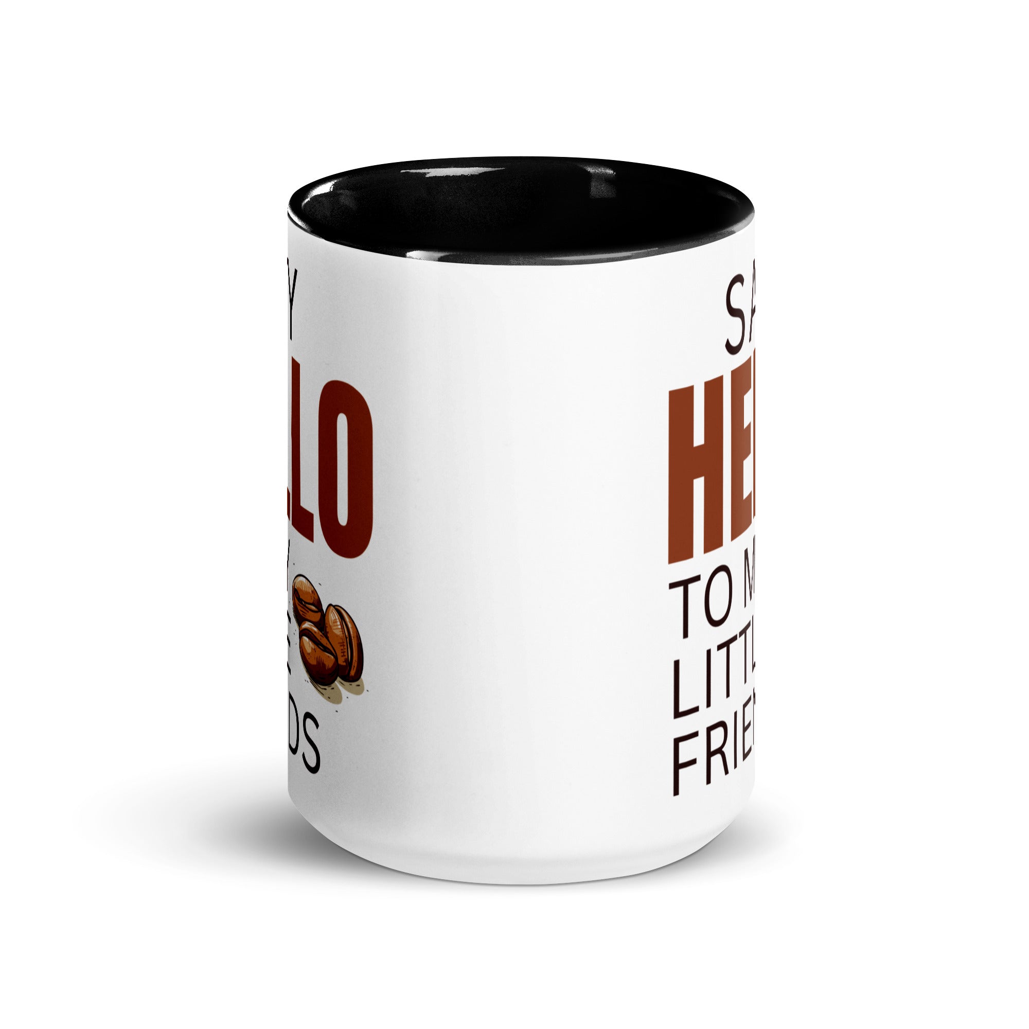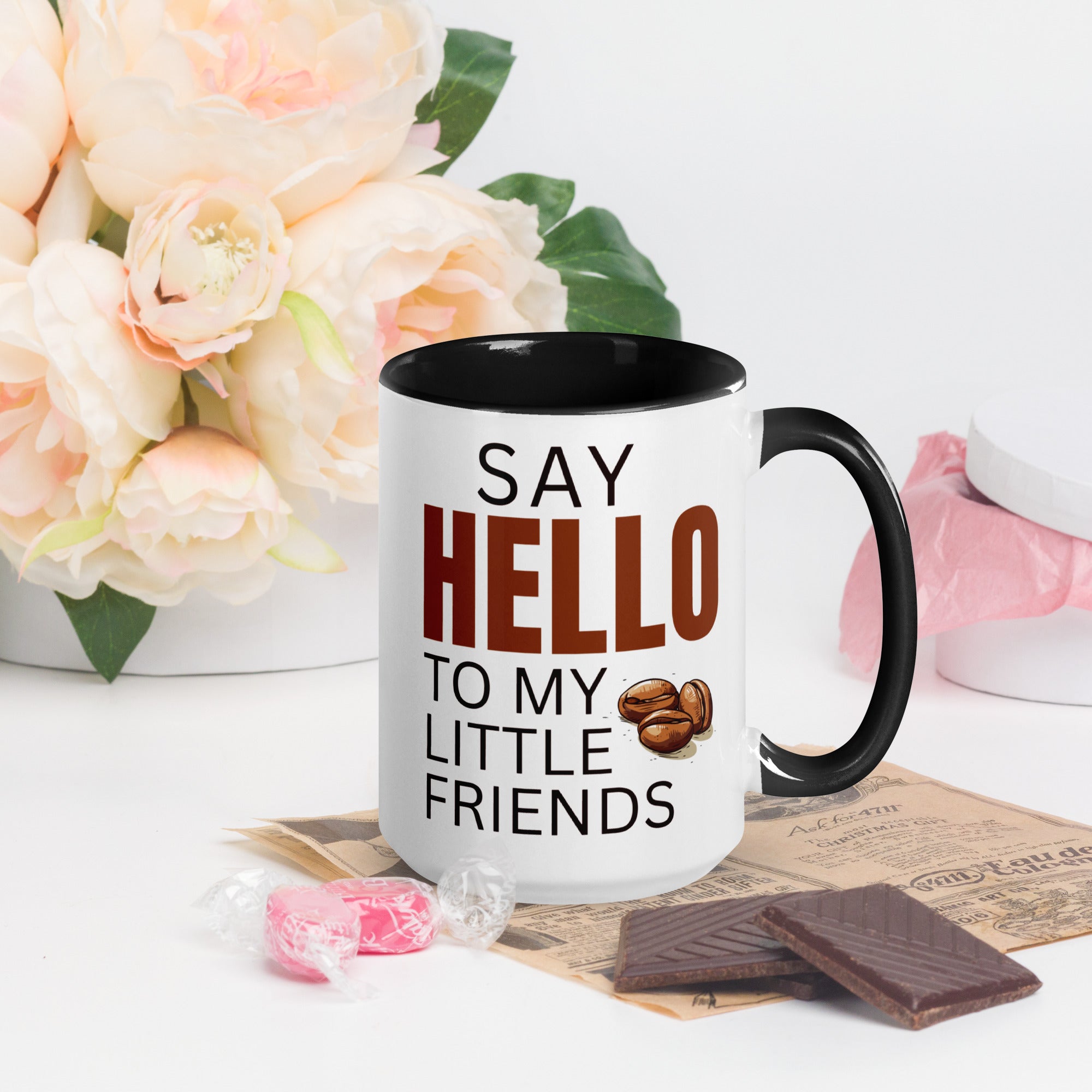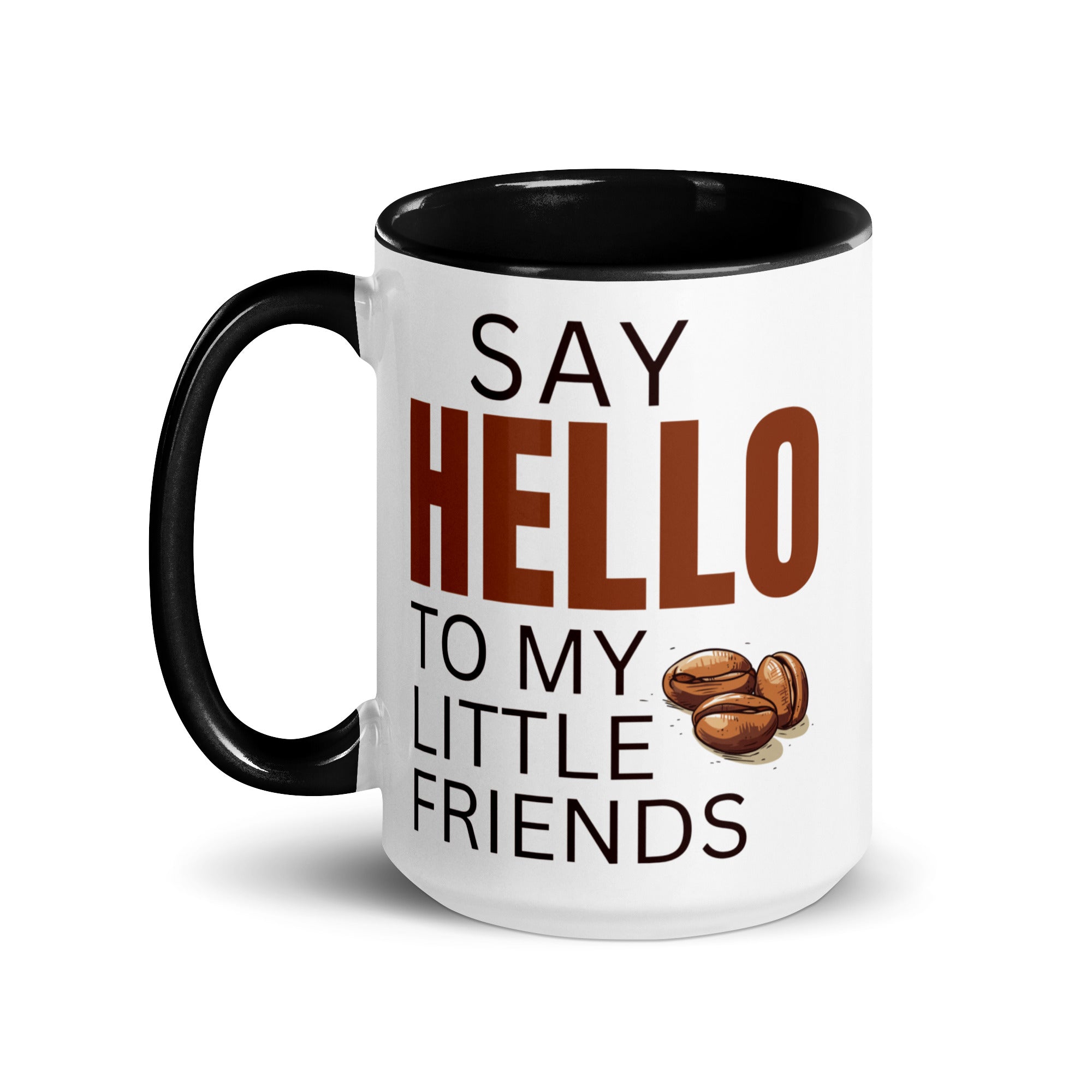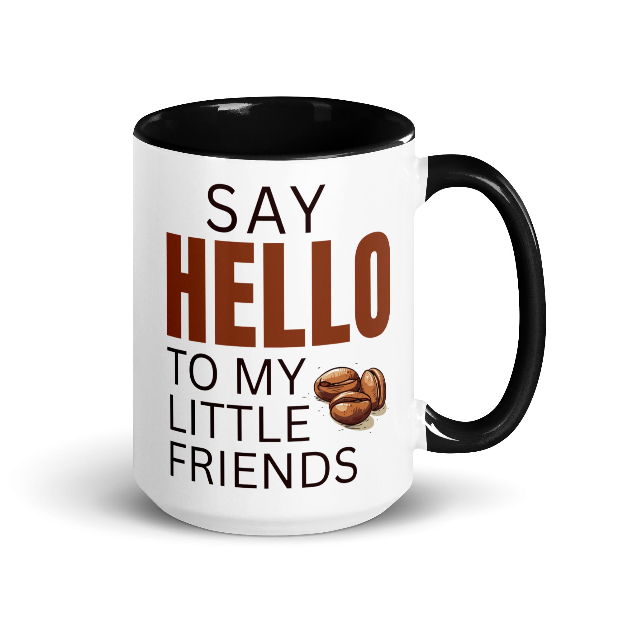 Our "Say Hello to My Little Friends" coffee mug features a playful design with a handful of coffee beans (aka your true besties) front and center. The bold text pops agains the white ceramic, paired with black handle and matching interior for a sleek, modern look. Printed on both sides, so no matter which way you sip, everyone knows where your loyalty lies - to coffee, obviously.