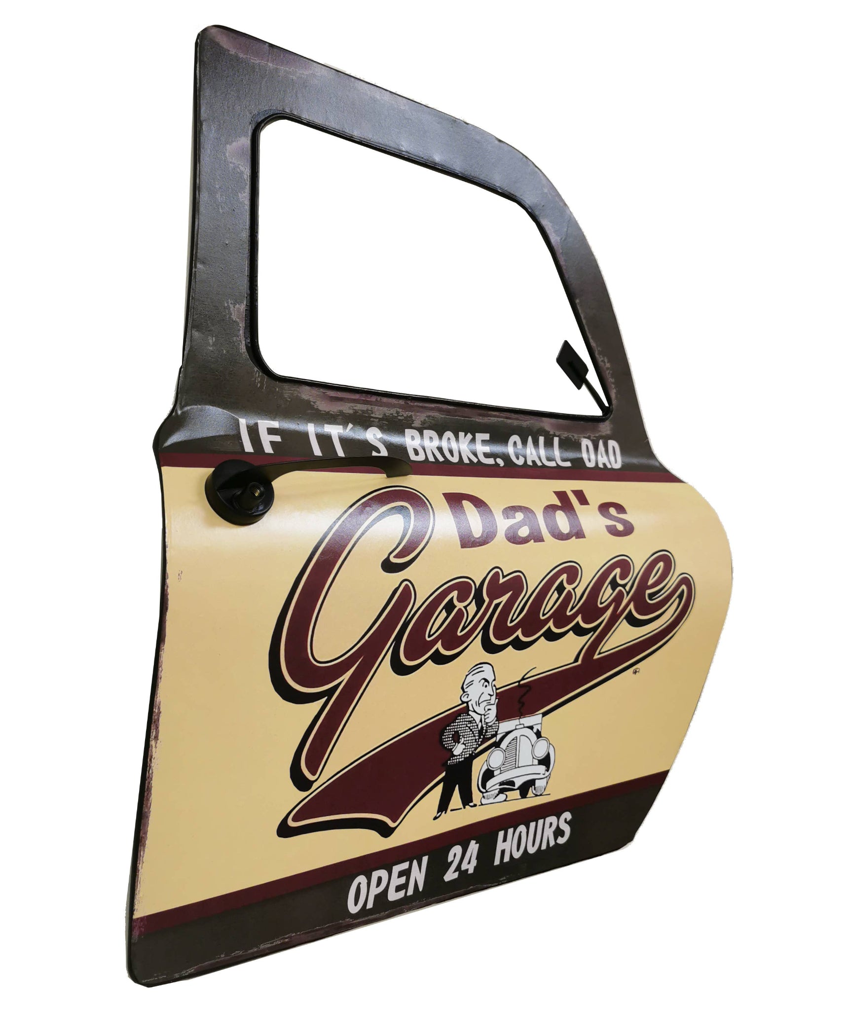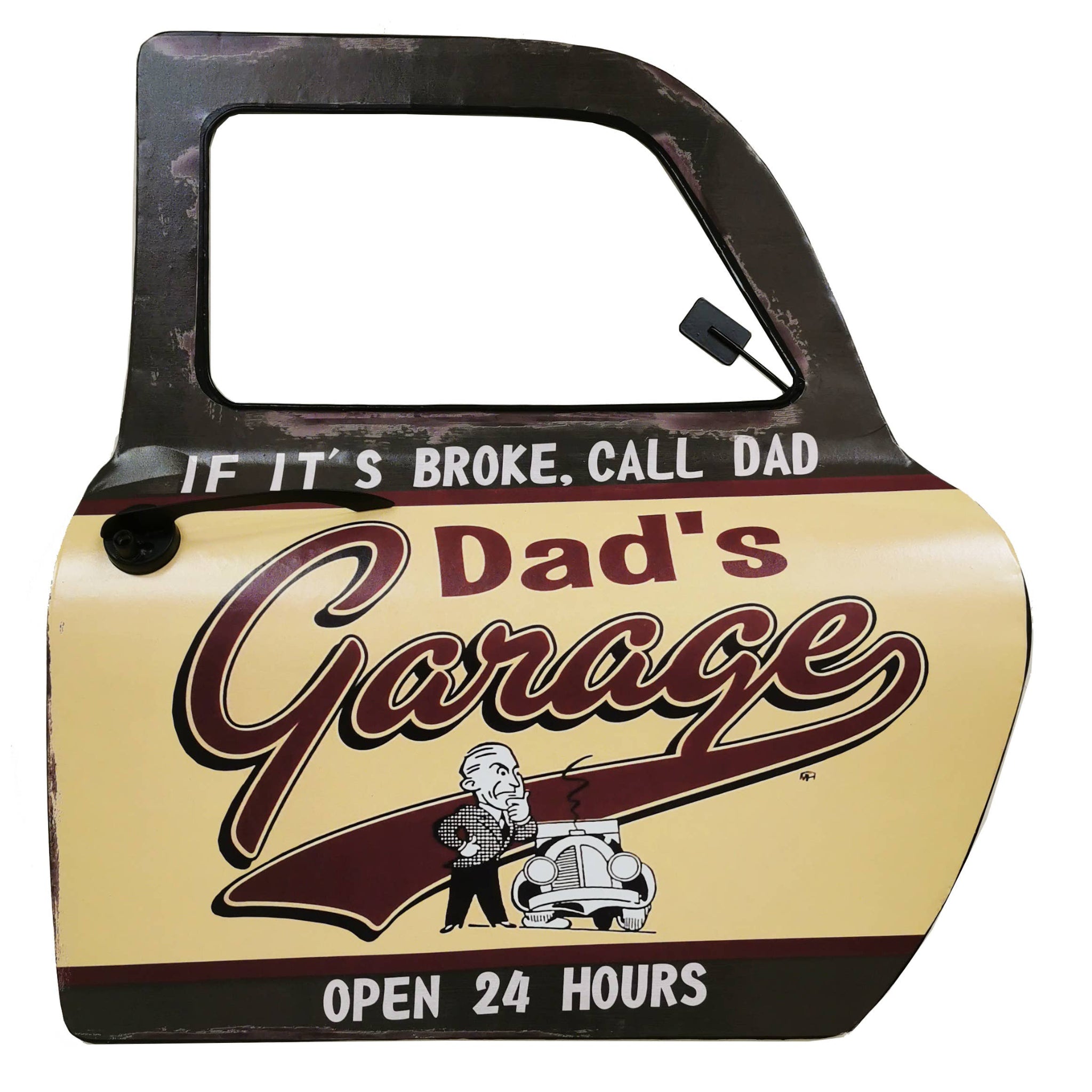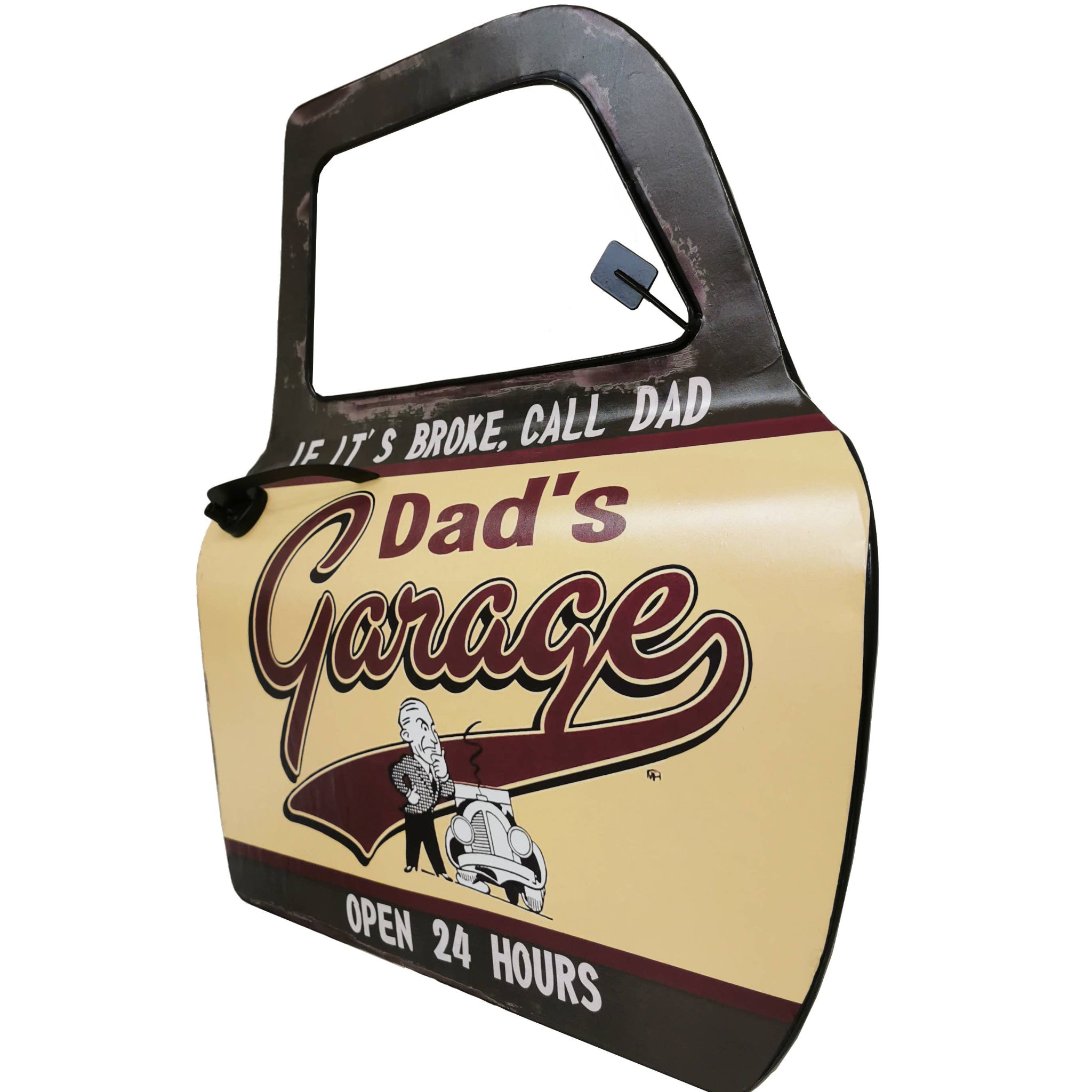 The “Dad’s Garage” Car Door Sign is a bold, automotive-inspired wall accent designed to look like a classic car door panel. It adds instant character to garages, workshops, man caves, or any space where engines, tools, and good stories come together.