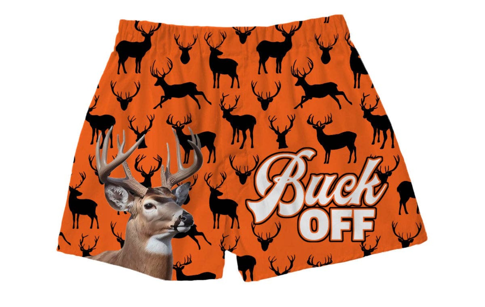 Make a statement without saying a word. These bright hunting-orange "Buck Off" boxer shorts are packed with attitude, sass, and a whole lot of deer swagger. Featuring an all-over black deer silhouette pattern and one ultra-realistic buck popping out for extra mischief, these boxers are perfect for guys who love humor, hunting, and unapologetic personality in their wardrobe.