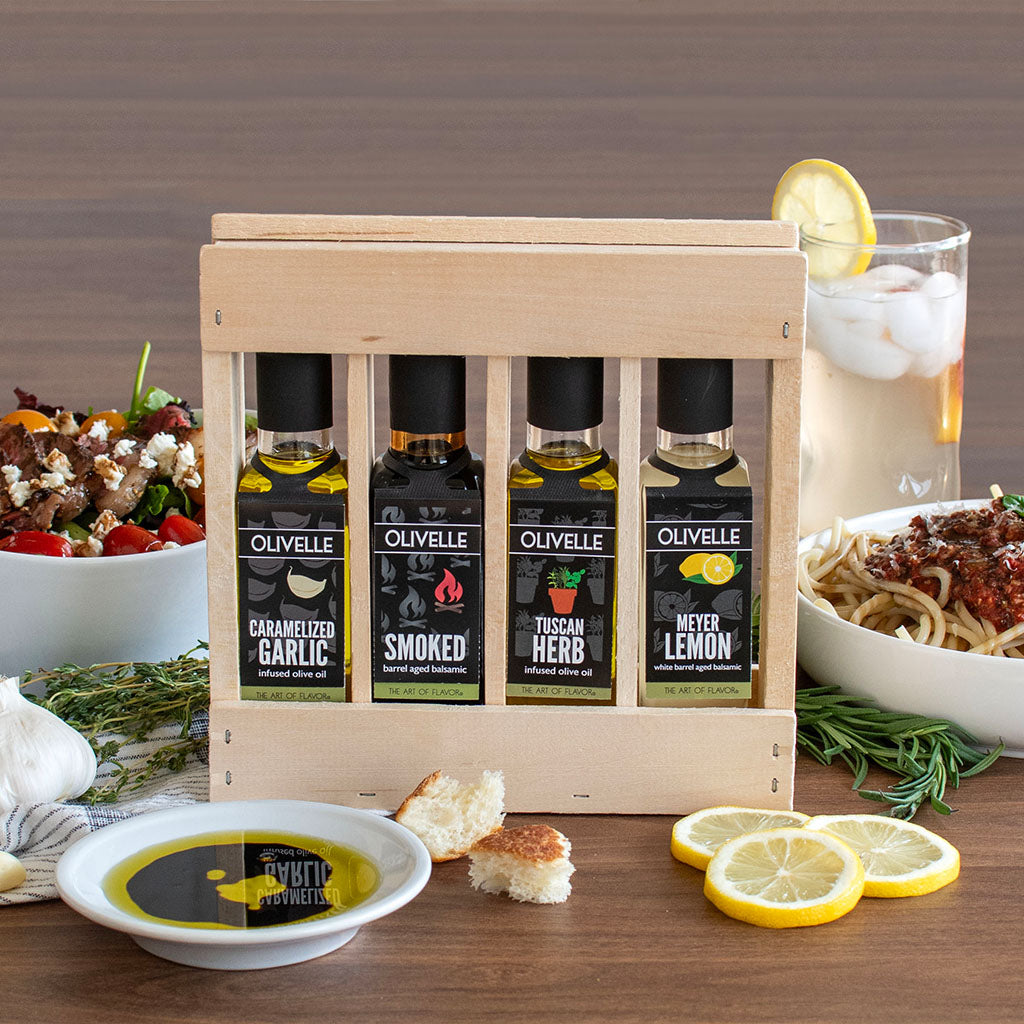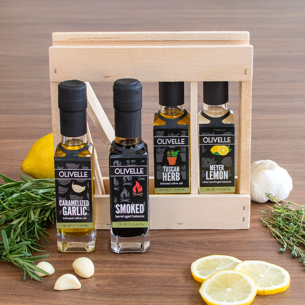 Bring bold, rich, and mouthwatering flavor to every meal with this gourmet Savory Pairing Gift Crate. Each olive oil and balsamic pairing is crafted to complement one another - from smoky and robust to bright and herbaceous. Perfect for anyone who loves experimenting in the kitchen, this collection turns simple dishes into extraordinary creations with just a drizzle or two.