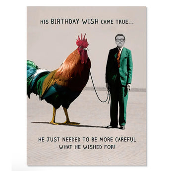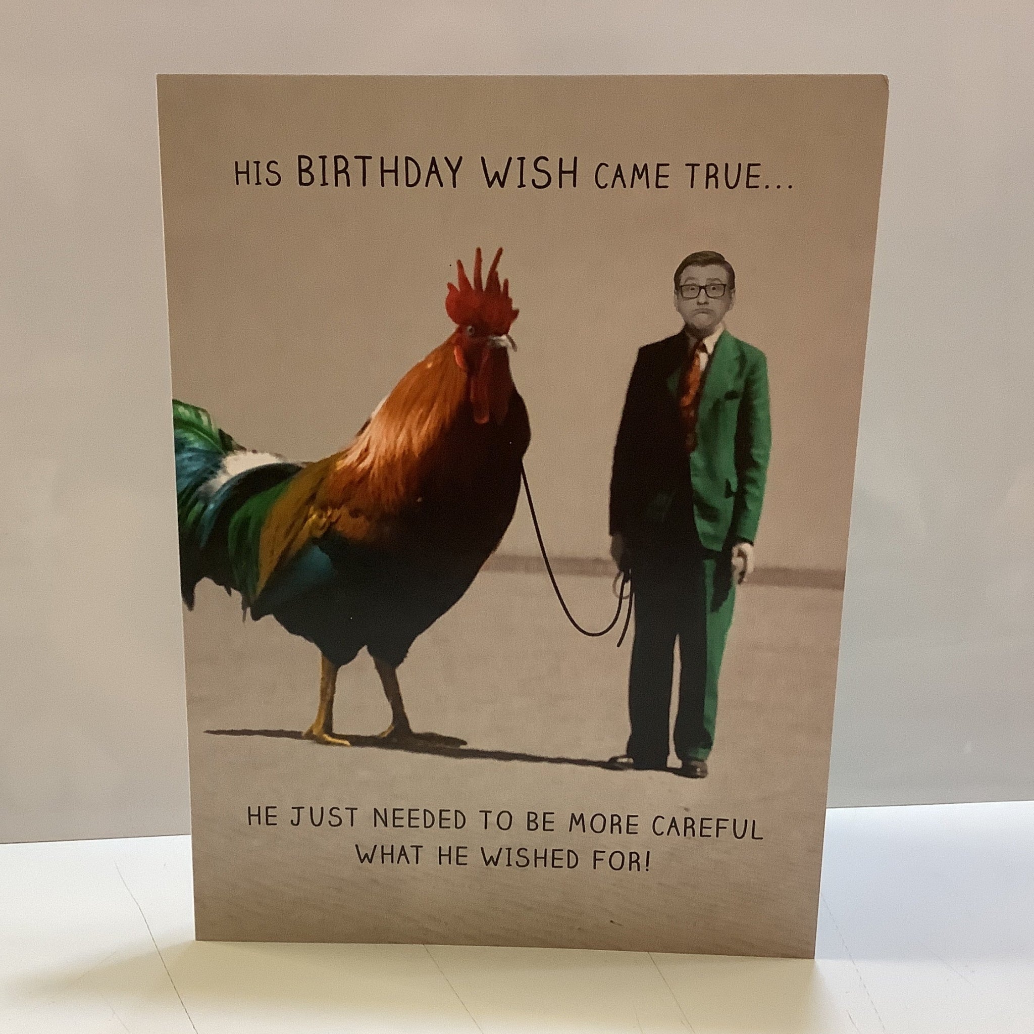 This hilarious birthday card features a man walking a giant rooster and the caption:
