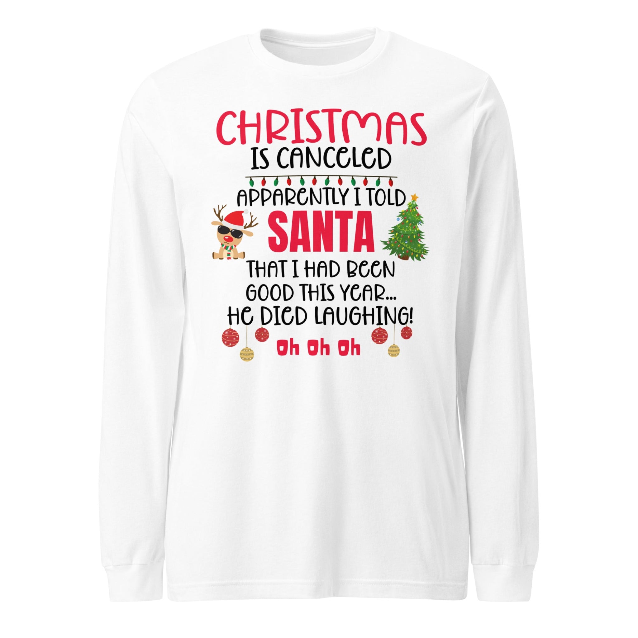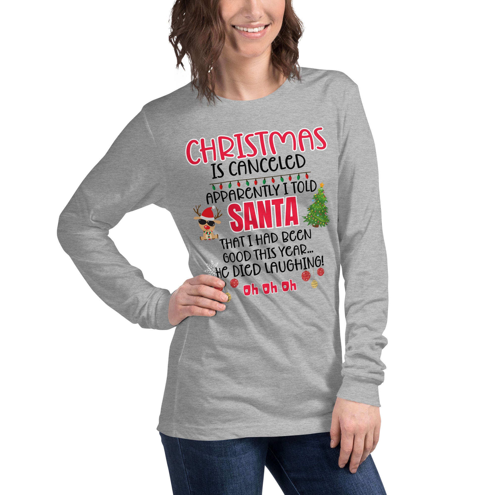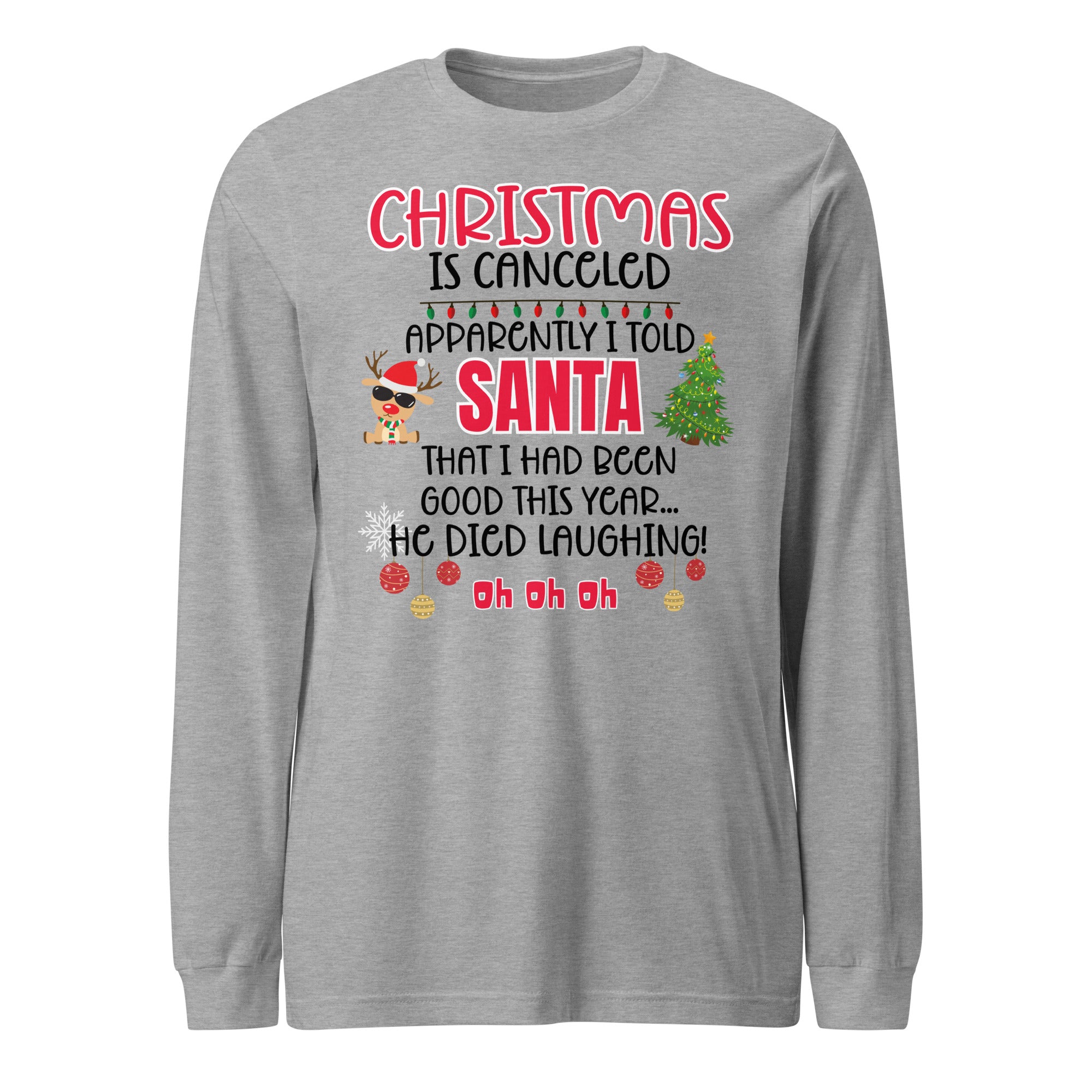 Our "Christmas Is Canceled" Long Sleeve Tee is made for anyone whose "nice list" status might be a little questionable. Featuring the hilarious quote, "Apparently I told Santa I'd been good this year...he died laughing! Oh oh oh! - this shirt delivers instant holiday laughs wherever you go.