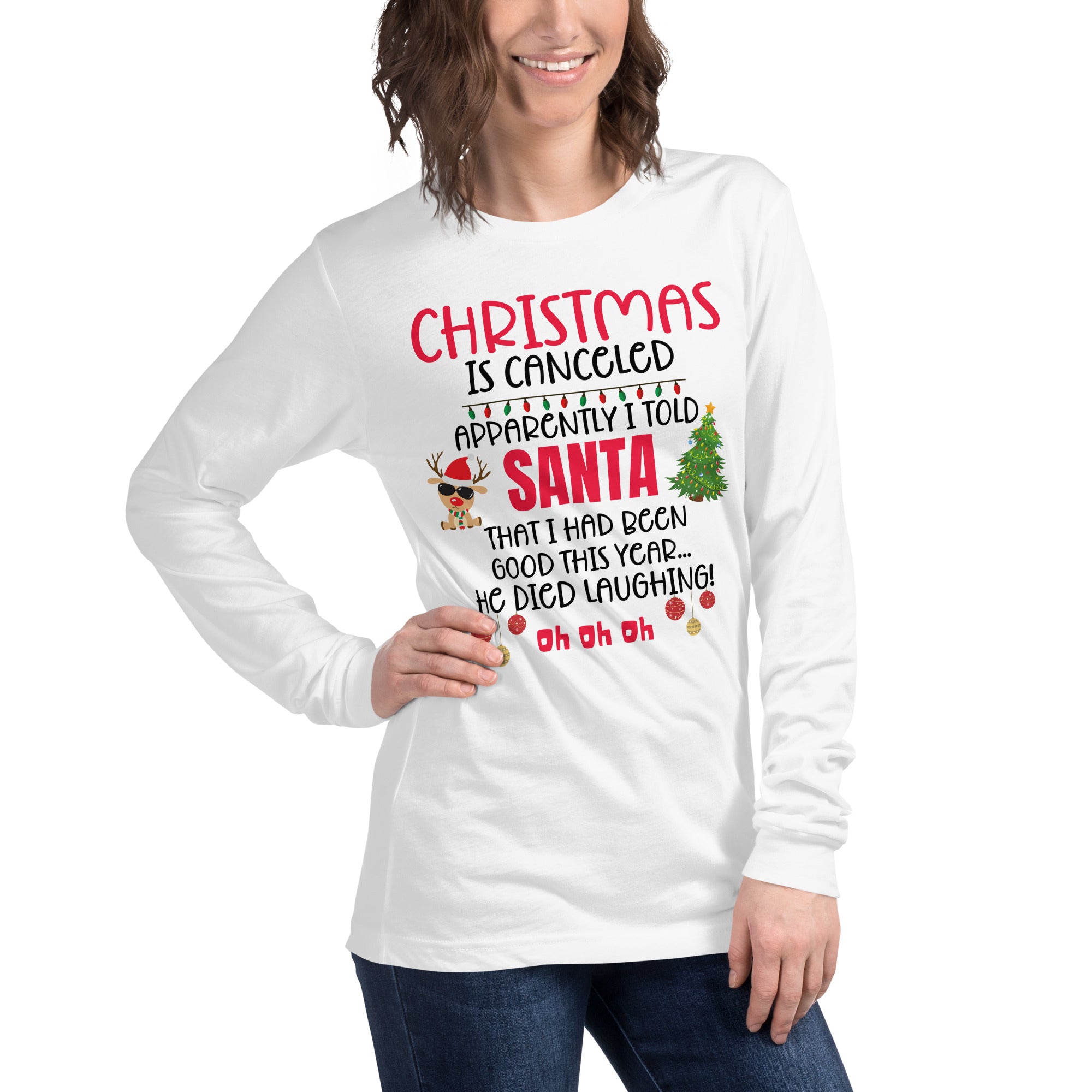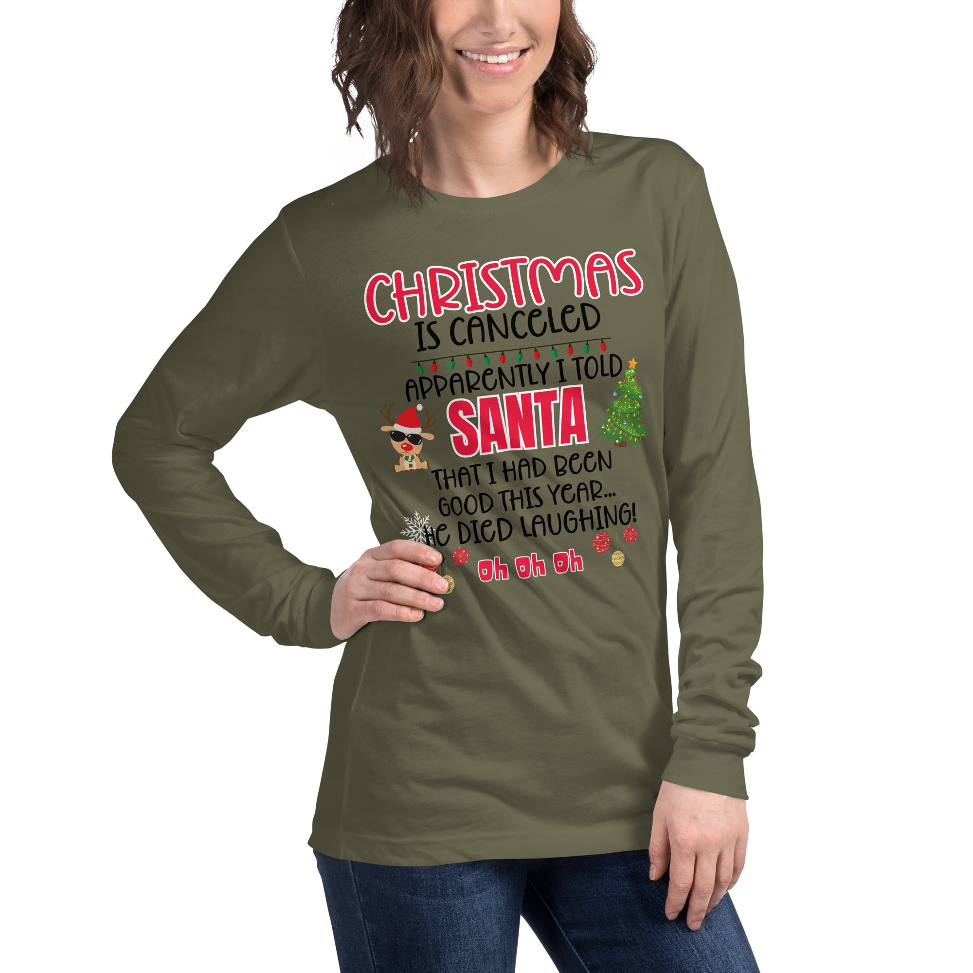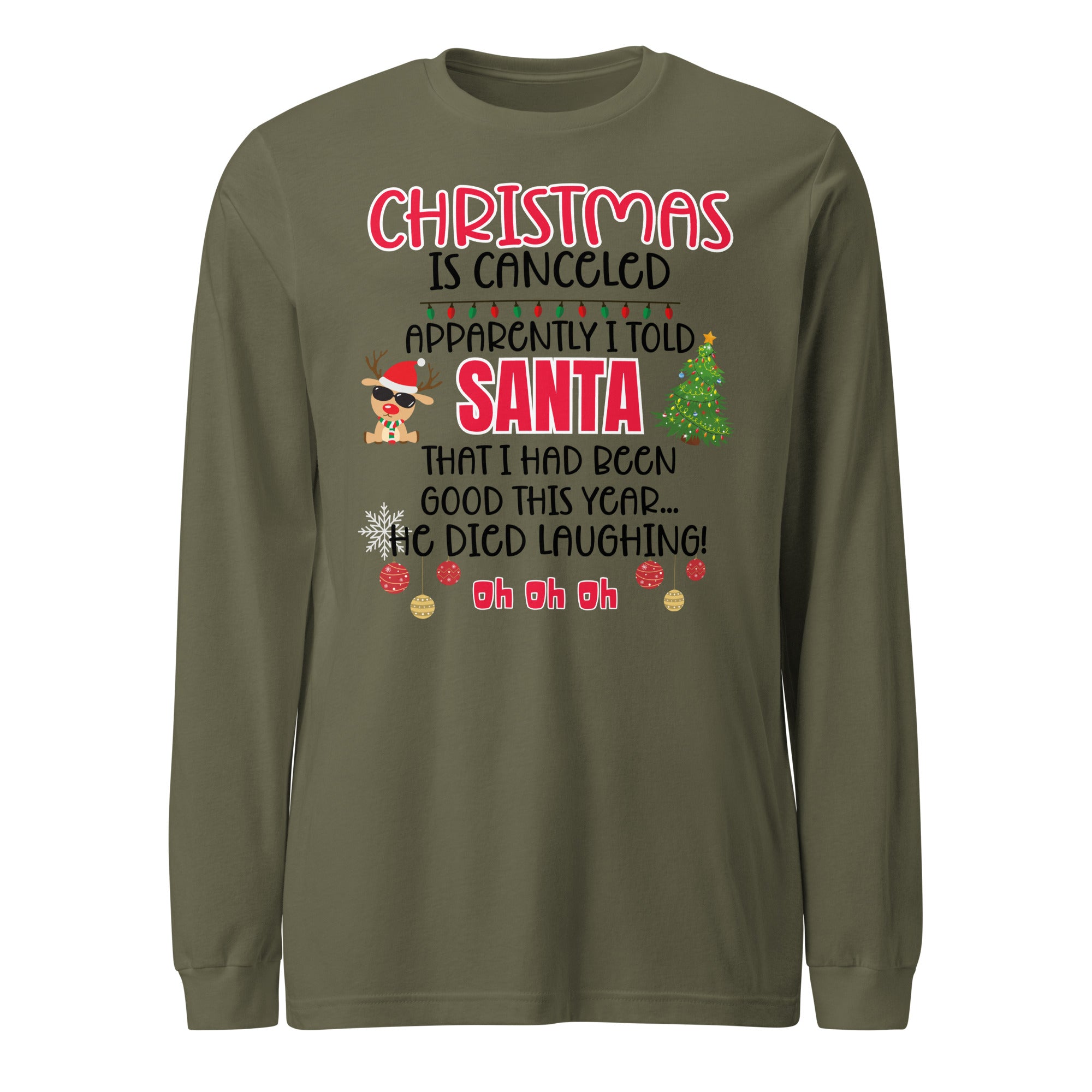 Our "Christmas Is Canceled" Long Sleeve Tee is made for anyone whose "nice list" status might be a little questionable. Featuring the hilarious quote, "Apparently I told Santa I'd been good this year...he died laughing! Oh oh oh! - this shirt delivers instant holiday laughs wherever you go.