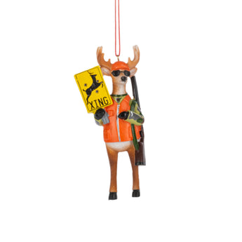 Meet the holiday ornament that flips the script! This hilarious Deer Crossing Ornament features a fully outfitted buck rocking sunglasses, an orange hunting vest, camo sleeves, and even carrying a rifle. To top it off, he’s holding a bullet-riddled “Deer XING” sign — because apparently, he’s had enough of everyone else doing the hunting.