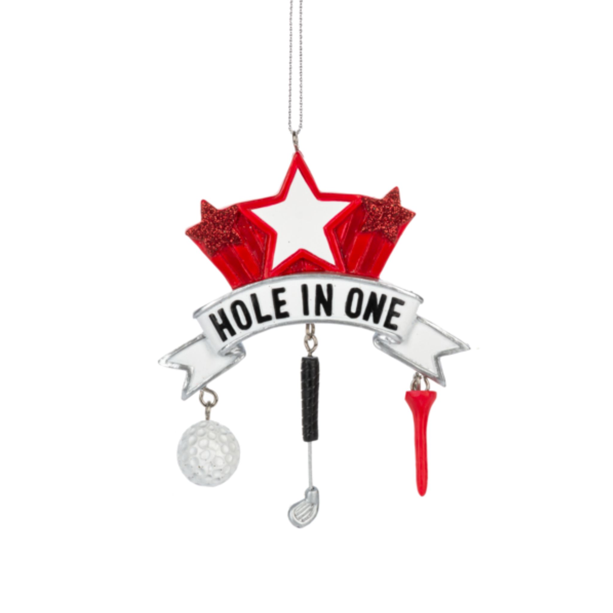 Whether they’ve actually hit a hole in one or just dream about it every weekend, this fun and flashy Golf Dangle Ornament is the perfect way to honor the ultimate golf achievement. With bold red stars, a crisp white banner, and three dangling charms — a golf ball, a club, and a tee — this ornament brings a burst of excitement to any holiday tree.
