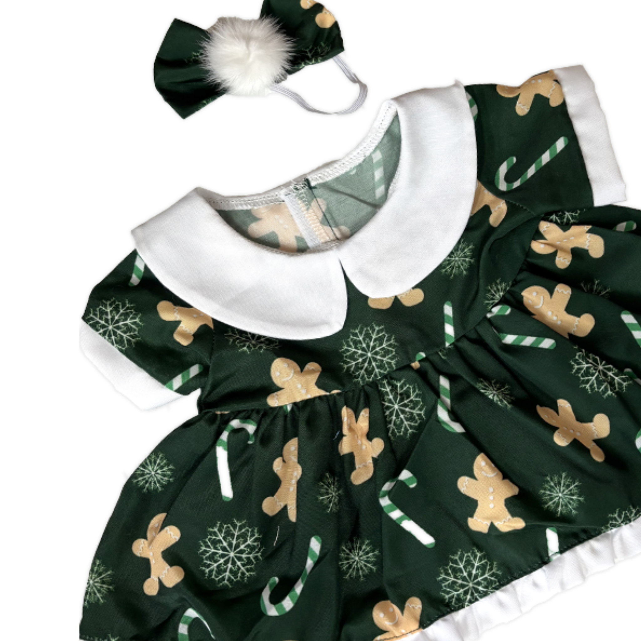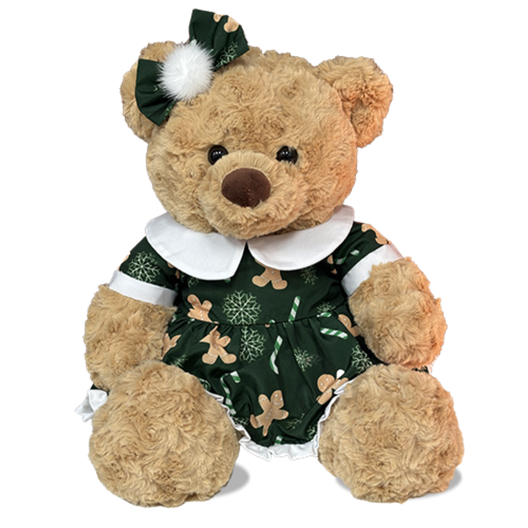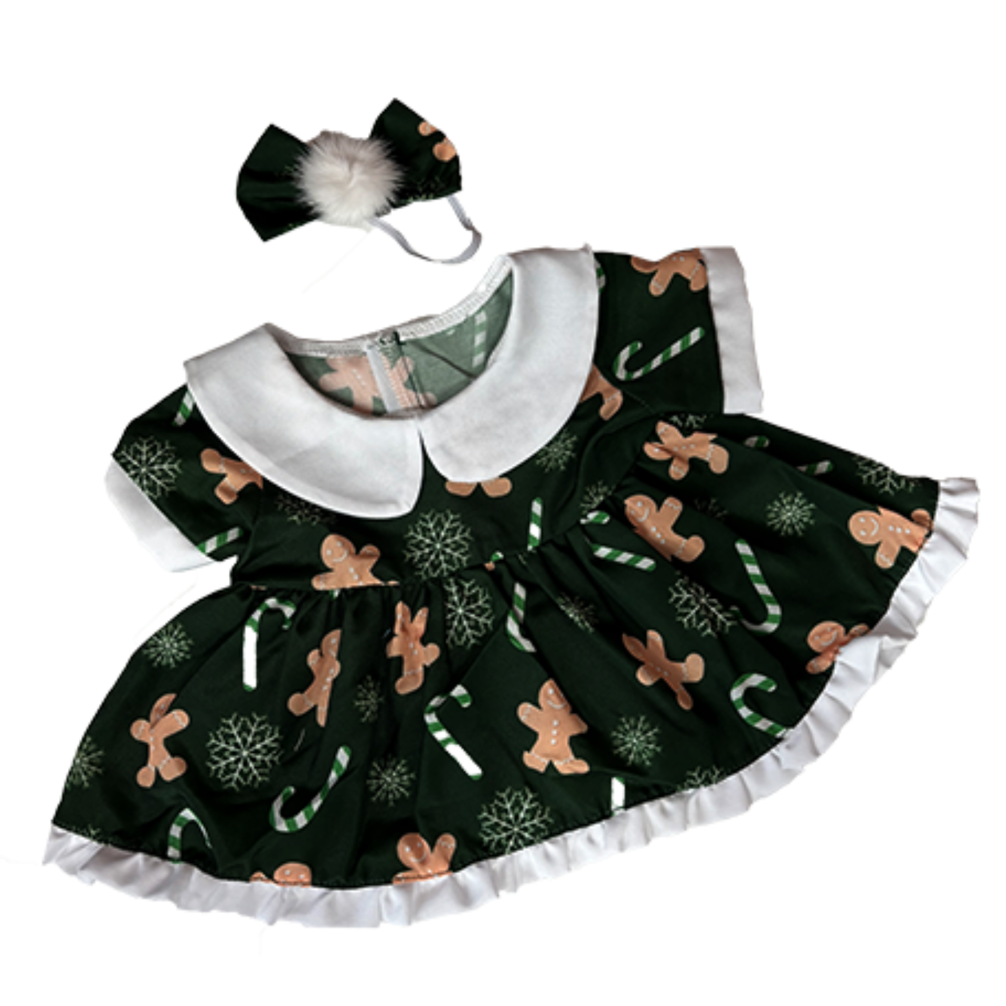Dress your cuddly buddy in the sweetest holiday style! This Green Gingerbread Dress is covered in cheerful gingerbread men, candy canes, and snowflakes, all topped off with an adorable Peter Pan collar. It even includes a matching ear/head bow to complete the festive look. Perfect for 16" teddy bears and stuffed animals who are ready to celebrate the season in style. (Bear sold separately!)