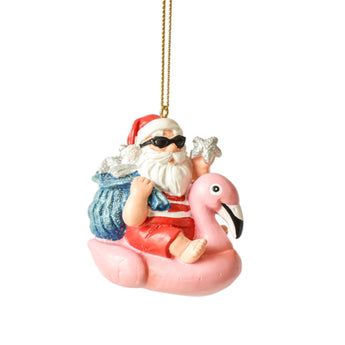- Features Santa on a pink flamingo with beachy accessories