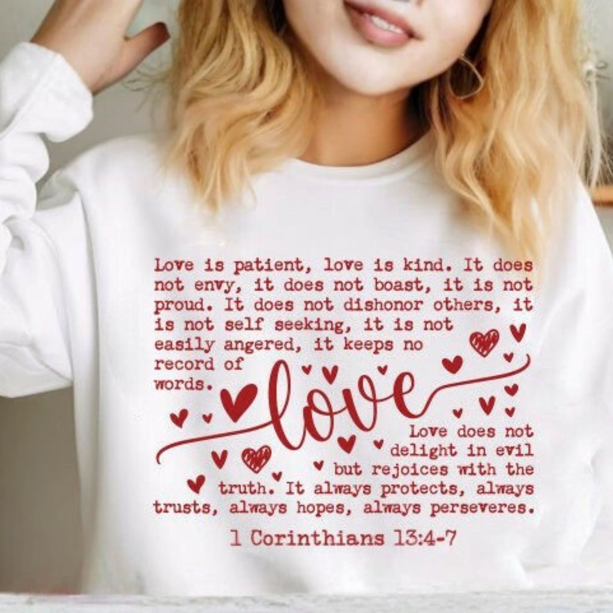Soft, cozy, and easy to style, this white sweatshirt is perfect for cool mornings, casual weekends, church days, or anytime you want a gentle reminder of what love really looks like.