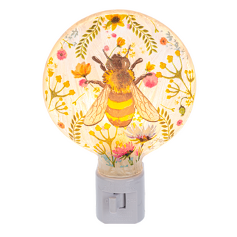 Floral Bee Disk Night Light with swivel switch, on/off swich and gift box. Uses a C7 bulb. Measures 4 1/4 inches wide x 1 1/2 inches deep by 5 5/8 inches tall.