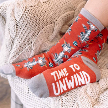 Wrap your feet in comfort and charm with our "Time to Unwind" Cat Crew Socks! Perfect for those days when you need a little extra relaxation, these socks feature a playful cat wrapped in yarn design, embodying the spirit of taking it easy. Made from a premium blend of 75% cotton, 15% nylon, and 10% spandex, they offer the perfect balance of comfort and durability. The Moab Sunset Pink base with contrasting grey heel and toe adds a pop of color to your day. With text "Time to Unwind" on the bottom, these socks are a reminder to kick back and enjoy your moments of peace. Ideal for cat lovers and anyone looking to add a cozy touch to their wardrobe!5